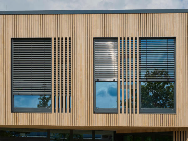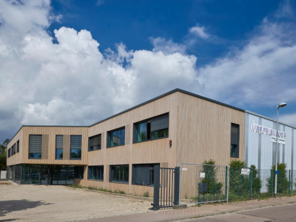 Die detaillierte Planung und Arbeitsvorbereitung erforderte viel Zeit und Sorgfalt, denn es galten unter anderem erhöhte Anforderungen an den Brandschutz. Materialien und Farben wurden gemeinsam mit den Planern und dem Auftraggeber ausgewählt. Die Auswahl des Fassadenmaterials für den Büroteil fiel auf Rhombusleisten aus Weißtanne. Die Kombination mit den dunklen Fensterrahmen ergibt ein ebenso kontrastreiches wie harmonisches Bild. Die Wände der Werkhalle wurden mit halbtransparenten Polycarbonatplatten verkleidet.